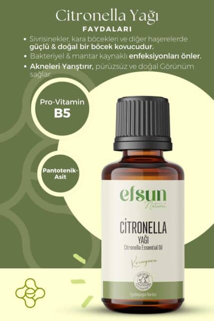 Citronella Uçucu Yağı: Doğal kokuya karşı koruma sağlar, özellikle yaz aylarında difüzörde kullanım için elverişlidir.