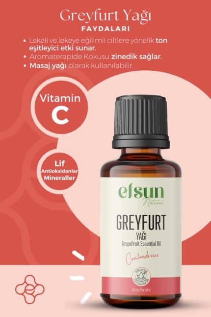 Greyfurt Uçucu Yağı: Gözenek sıkılaştırıcı ve detoks destekli etkisiyle cilt bakımında olumlu katkısı vardır.