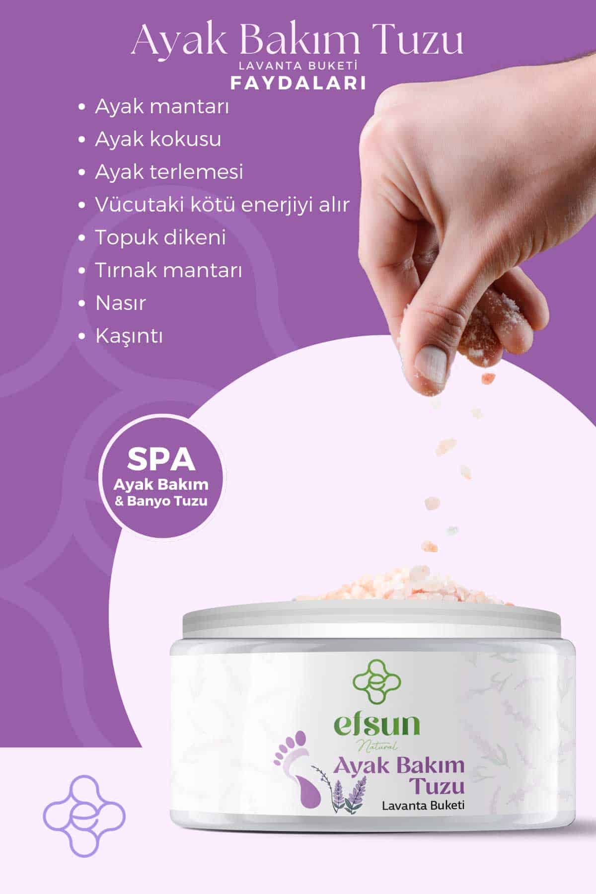Lavanta Ayak Bakım Tuzu, lavantanın sakinleştirici kokusu ve mentollü formülüyle ayakları rahatlatır, kötü kokuları hafifletir ve yumuşak bir cilt hissi sunar.