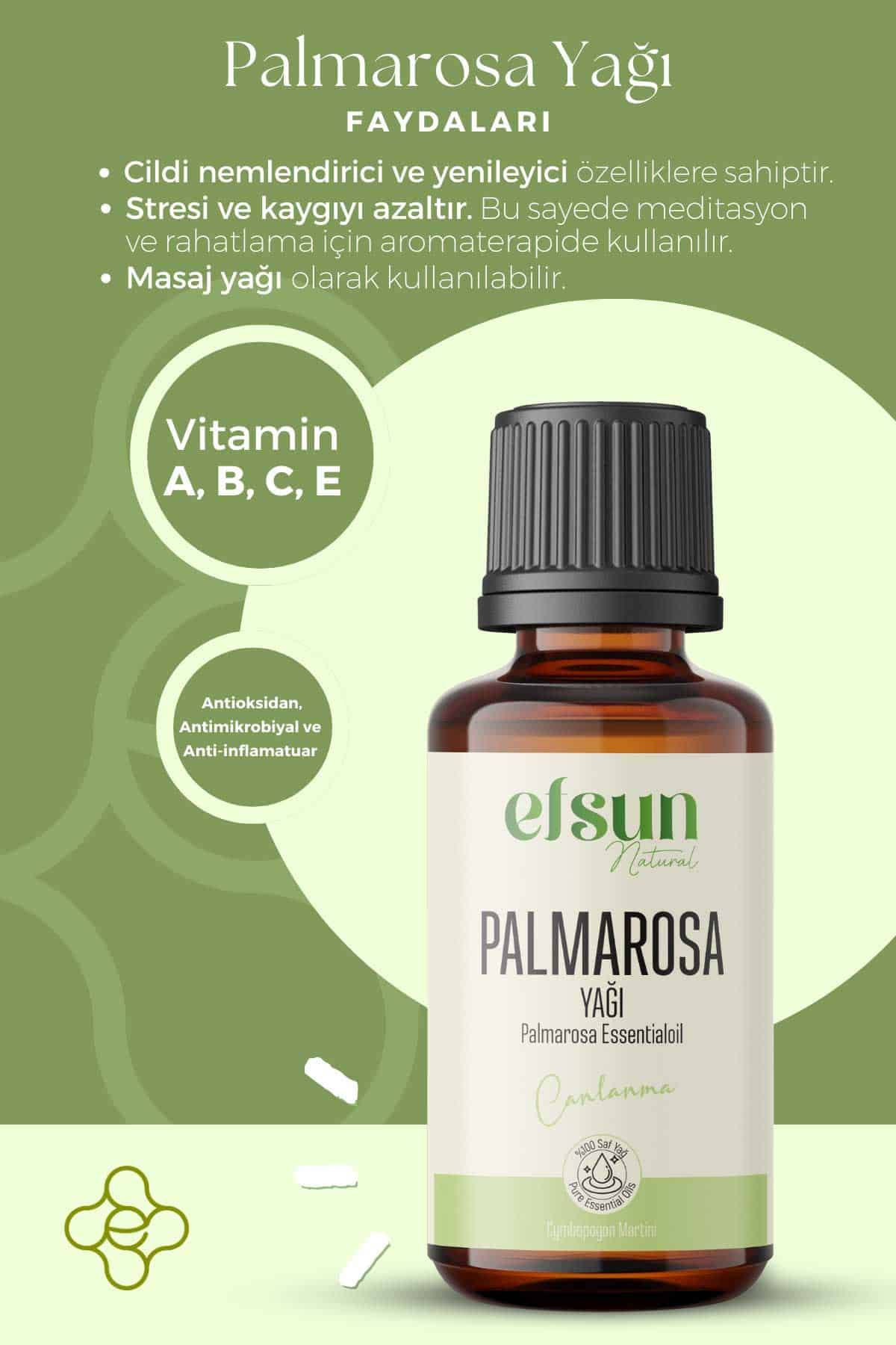 Palmarosa Uçucu Yağı, tatlı, hafif çiçeksi aromasıyla bilinen ve hem zihinsel hem de fiziksel rahatlama amacıyla kullanılan doğal bir esans yağıdır. Aromaterapide duygusal dengeyi desteklemek ve zihinsel yorgunluğu hafifletmek için tercih edilir. Hoş kokusuyla ferahlatıcı bir atmosfer yaratır, özellikle stresli anlarda ve yoğun tempolu günlerde rahatlatıcı etkisiyle öne çıkar.