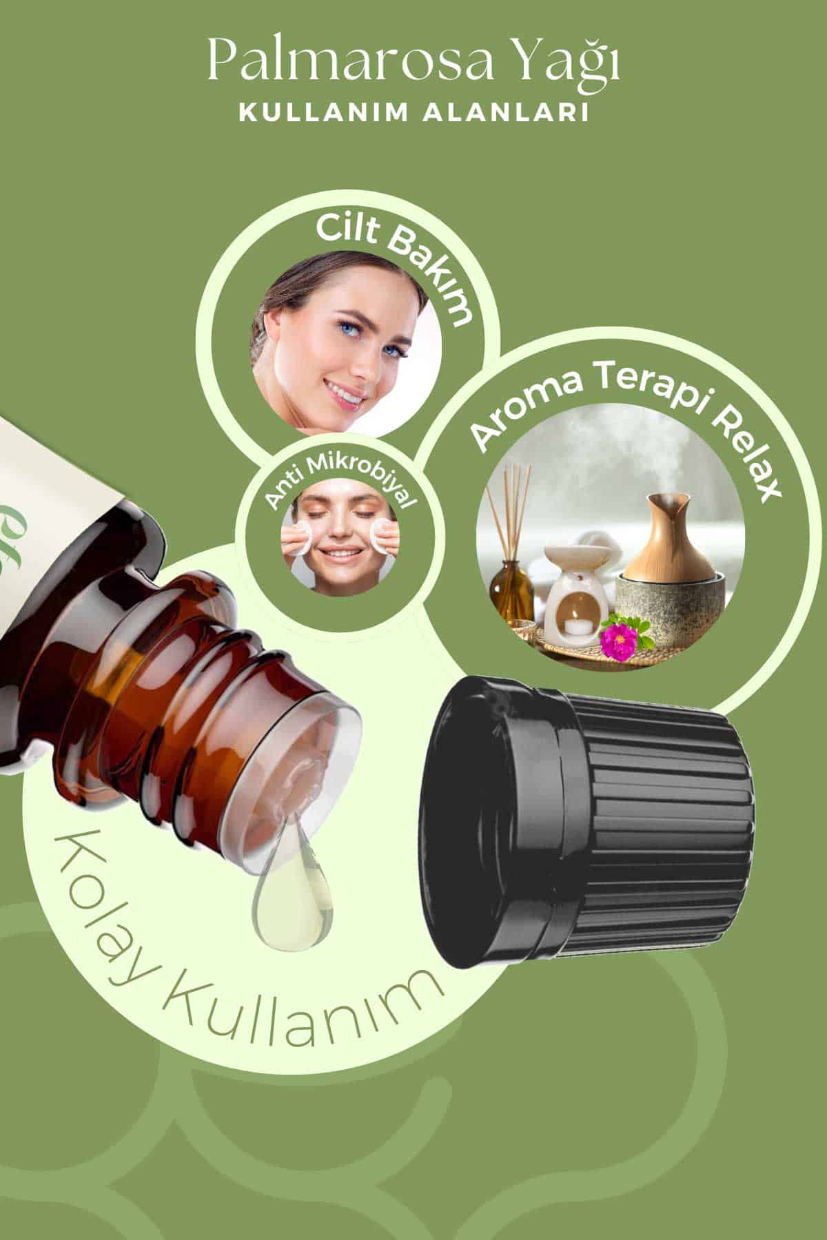 Difüzör ile ortam kokulandırmada ya da taşıyıcı yağlarla seyreltildiğinde cilt ve vücut bakımında kullanılabilir. Doğal bakım rutininize hem dengeleyici hem canlandırıcı bir katkı arıyorsanız, Palmarosa Uçucu Yağı zarif aromasıyla ideal bir tercih olabilir.