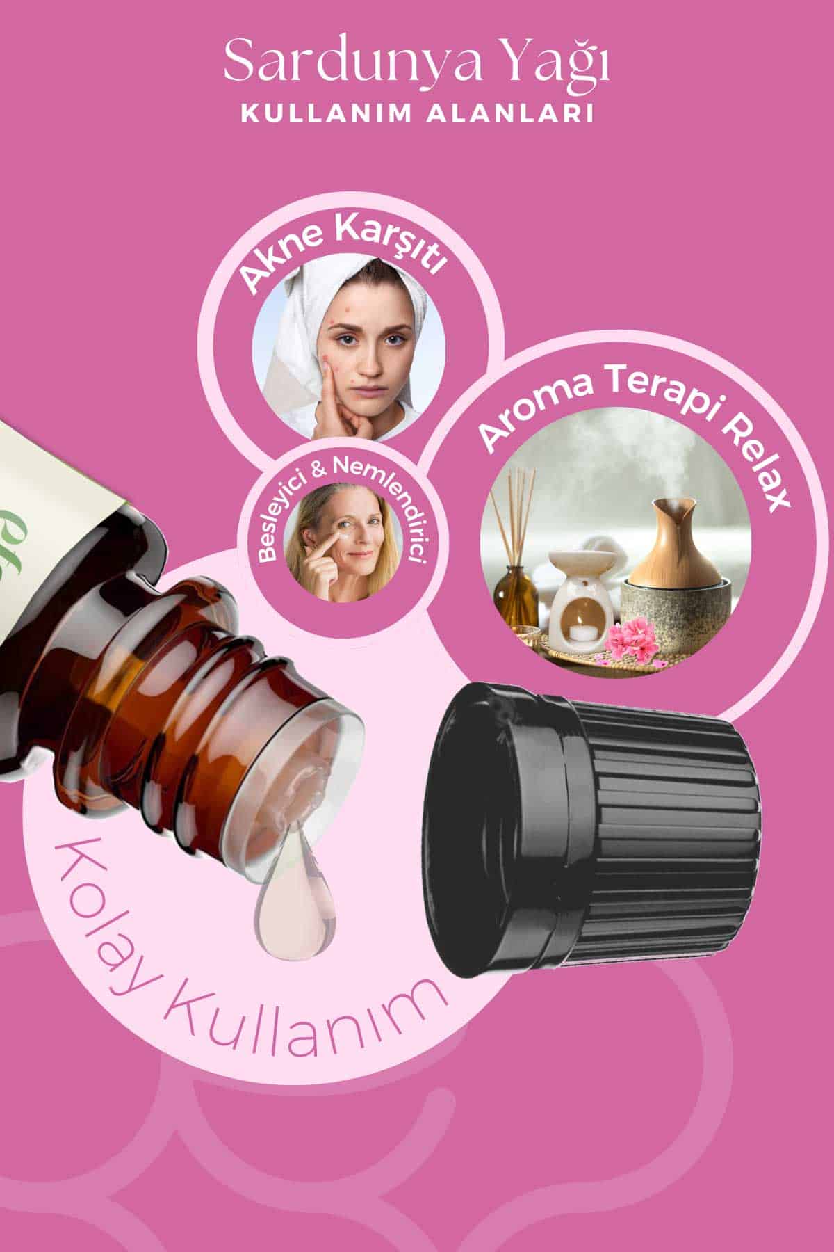 Sardunya Uçucu Yağı, aromaterapide rahatlatıcı etkisiyle; cilt bakımında ise dengeleyici özellikleriyle tercih edilir. Ruh halini dengelemeye, akne görünümünü azaltmaya ve cildi yumuşatmaya yardımcı olur.