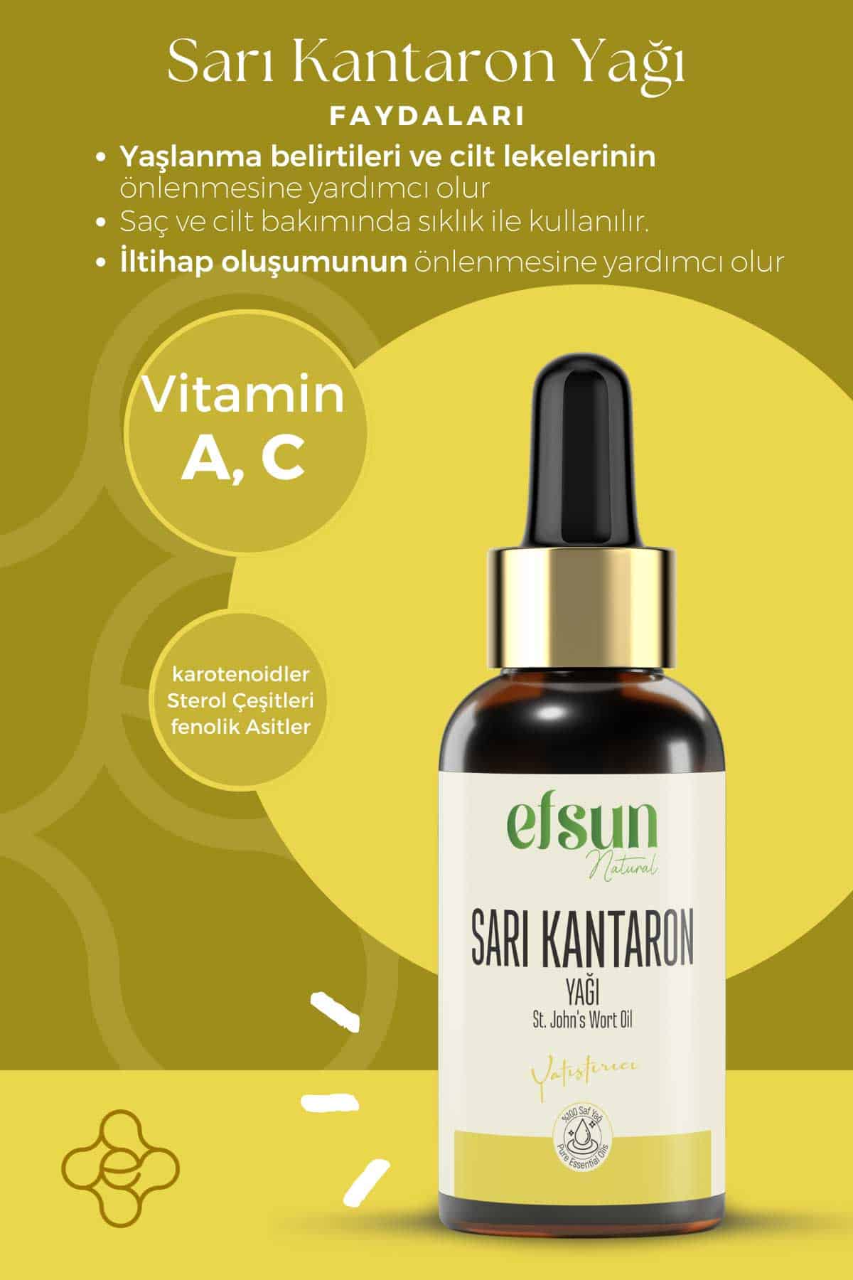 Sarı Kantaron Yağı, özellikle tahriş olmuş ciltlerde ve dış etkenlere bağlı hassasiyetlerde tercih edilir. İçeriğindeki hypericin ve flavonoidler, antioksidan özellikler taşıyarak ciltteki hücre yenilenmesini destekler. Güneş yanığı, çatlama, kuruluk, kaşıntı ve kızarıklık gibi problemlerle mücadelede etkili bir destek sağlar. Aynı zamanda düzenli kullanımda, cilt tonunun dengelenmesine ve cildin daha sağlıklı görünmesine katkı sunar. Efsun Natural Sarı Kantaron Yağı, gece bakım yağı olarak da kullanılabilir. Cilde yatmadan önce birkaç damla uygulandığında, sabah daha dingin ve dengeli bir cilt görünümü sağlar.