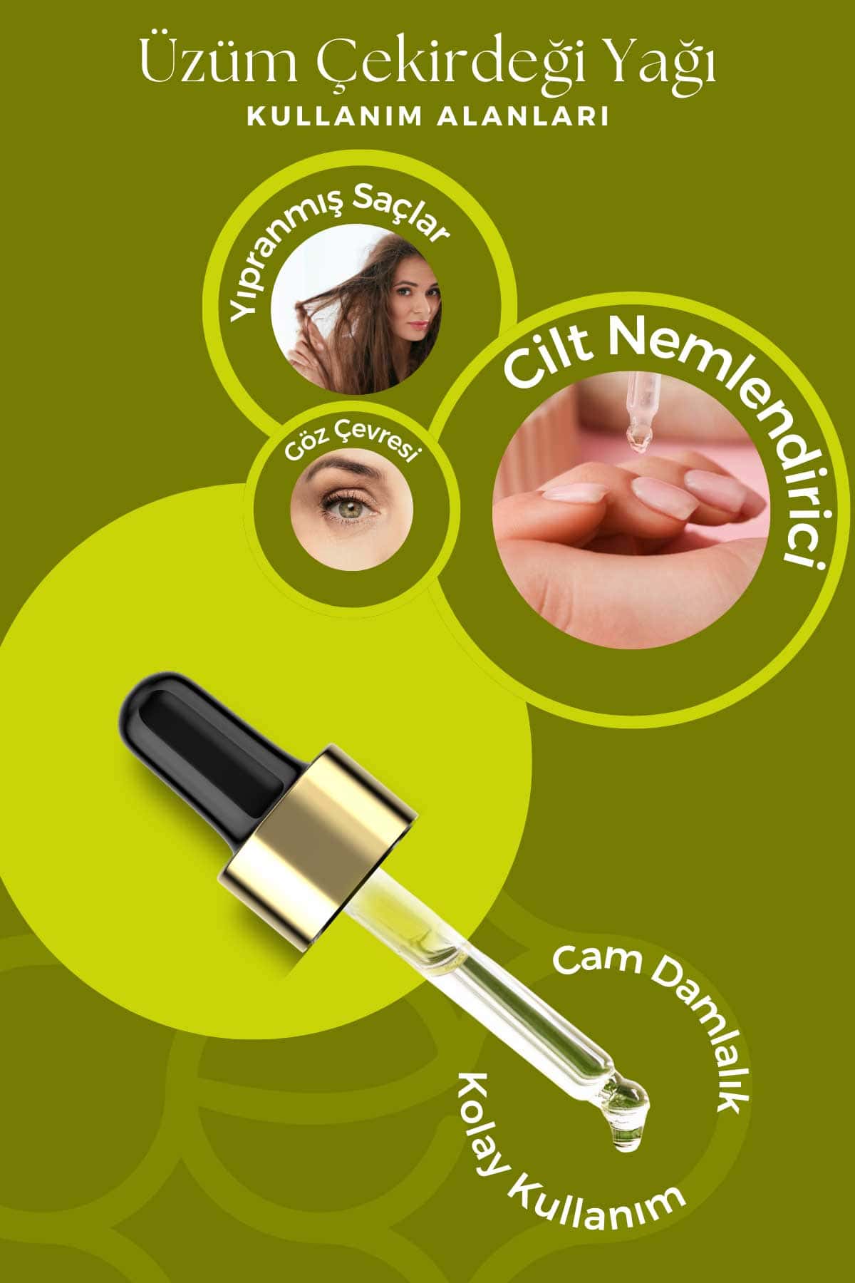 Saç bakımında da kullanılabilen üzüm çekirdeği yağı, özellikle kuru saç uçlarında nemlendirici ve yumuşatıcı etkisiyle bilinir. Doğal, hafif ve çok yönlü bir bakım ürünü arayanlar için ideal bir tamamlayıcıdır.
