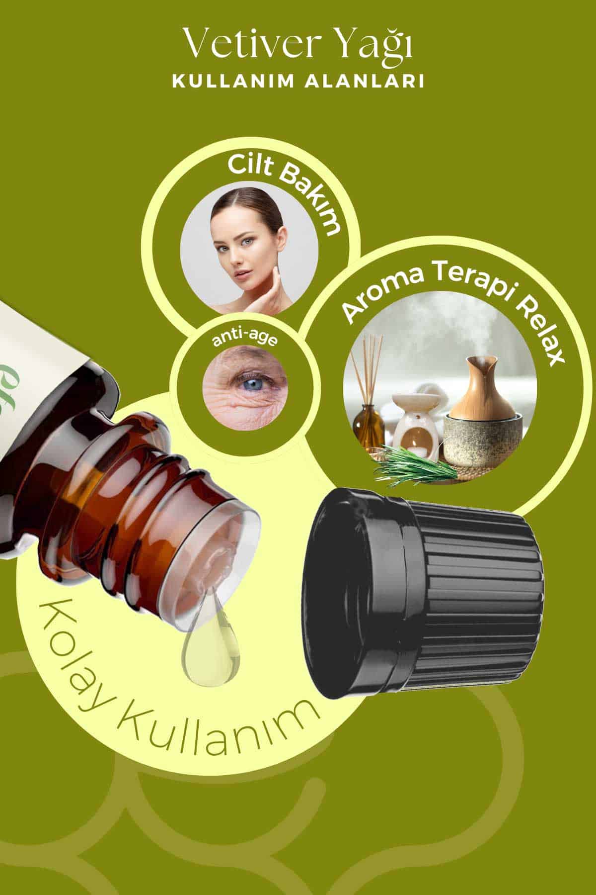 Vetiver Uçucu Yağı, stres ve uykusuzluk gibi durumlarda zihinsel rahatlama sunar. Cilt bakımında nemlendirici ve yatıştırıcı etkisiyle kuru, hassas ciltleri beslemeye yardımcı olur.